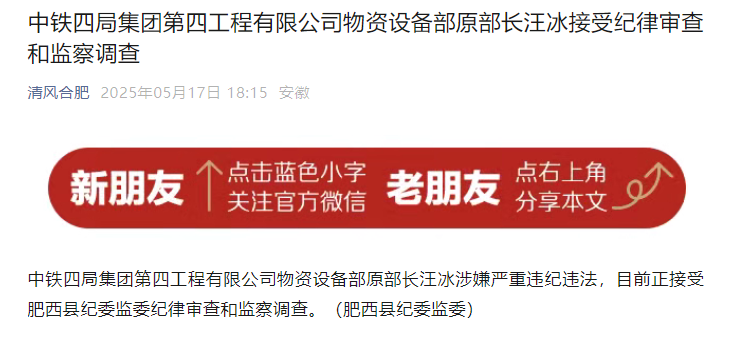 5月17日,中铁四局集团第四工程有限公司物资设备部原部长汪冰被查。