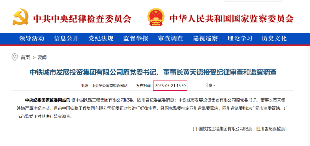 2025年5月21日,据中国铁路工程集团有限公司纪委、四川省纪委监委消息: